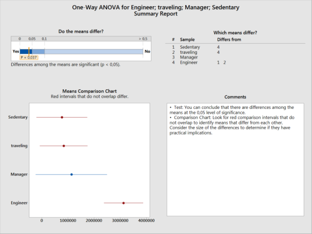 Das Team untersuchte mit der einfachen ANOVA im Menü „Assistent“ von Minitab die Beziehung zwischen dem Umsatz und den Profilen der Vertriebsmitarbeiter: ortsgebunden, mobil, Manager und Techniker. Die Ausgabe des Assistenten ist übersichtlich und leicht zu interpretieren. Sie zeigte, dass der mittlere Umsatz für das Profil „Techniker“ vom mittleren Umsatz der Profile „Ortsgebunden“ und „Mobil“ abweicht.