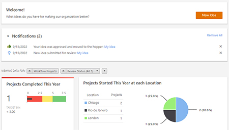 Mit dieser Version sehen Sie bei der Anmeldung in Engage sofort die Workflow-Seite, sodass Sie die Auswirkungen der Initiativen Ihres Unternehmens leicht erkennen und schnell neue Ideen entwickeln können. Außerdem bietet die Workflow-Seite jetzt Zusammenfassungen auf einen Blick, aus denen hervorgeht, welche neuen Ideen in diesem Jahr eingereicht wurden, welche Projekte derzeit aktiv sind und welche Projekte in diesem Jahr abgeschlossen wurden.