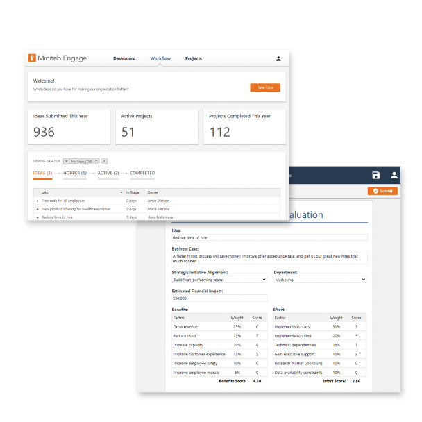 Inste a los equipos a reproducir los éxitos en toda la organización utilizando Minitab Engage para iniciar, dar seguimiento, gestionar y compartir iniciativas de innovación y mejora desde la generación de ideas hasta la ejecución.