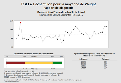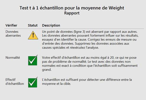 Les rapports vérifient votre analyse en proposant des vérifications d'hypothèses et en identifiant tout problème dont vous devriez être conscient. Il peut s'agir de points de données aberrants ainsi que de problèmes de normalité et d'effectif d'échantillon.