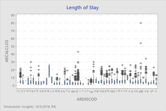 Que pouvait mettre en place l'équipe pour aider le personnel à mieux gérer ces heures de pointe ? Au départ, des données sur la durée d'hospitalisation (DH) ont été présentées pour 57 lieux de sortie différents, comme illustré dans la figure 2 ci-dessous, avec la durée d'hospitalisation sur l'axe des Y et les codes de sortie sur l'axe des X. Grâce à la fonctionnalité de recodage de Minitab, les données de DH et leur interprétation ont pu être simplifiées.