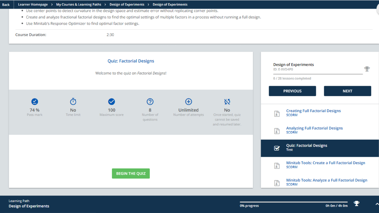 そこで、Minitabは、教材およびトレーニングと一緒に利用する、自分のペースで学べるオンラインの学習計画を作成しました。従業員は、自分が使用しているツールに対応する教材を使用し、自分の話す地元の言語で、自分のペースで学習することになります。実世界の例や演習が、各レッスンの貴重なコンテキストになっています。ユーザーは、新たに得たスキルを、仕事で直面する課題に直接生かすための知識と自信を身につけます。専門家による評価を見て、従業員が自分の仕事をもっとうまく効率的に果たすのに役立つ教材を学ぶように取り計らうことができます。