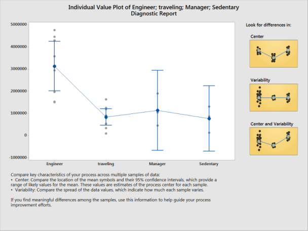 個別値プロットは、各試料の個々の値を検査して、試料分布を評価します。各値を別々にグラフ化することで、グラフは分布の広がりを表示し、潜在的な外れ値を特定するのに役立ちます。上記のグラフは、エンジニアに関連する平均収益が、出張あり、マネージャー、またはデスクワークのプロファイルを持つ営業チームメンバーの平均収益よりも大きいことを示しています。