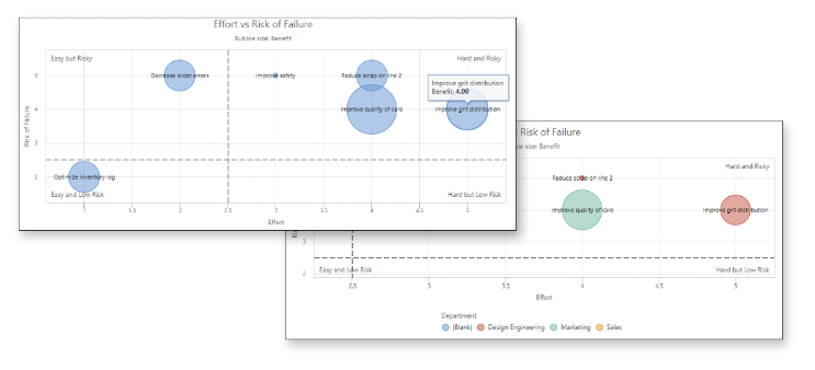 Minitab Engage의 자동 이익-노력-위험 요약 기능은 최선의 기회들을 빠르게 식별하고 우선순위를 지정할 수 있게 도와주며 가장 큰 영향력을 가장 빠르게 발휘하는 방법을 찾아줍니다. 여러분의 혁신 과정을 더욱 가속화해 보세요.