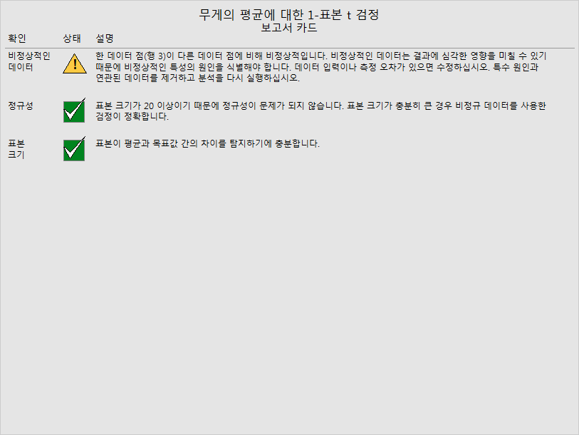 보고서 카드는 가정에 대한 타당성 확인을 제공하고 비정상적인 데이터 점, 정규성 및 표본 크기 문제 등 알고 있어야 하는 문제를 식별하여 분석을 확인합니다.