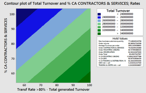위의 등고선도는 총 매출량 또는 수익(회색 영역으로 표시)에 대한 전송 속도, 계약자 및 서비스(각각 x 및 y 척도에 표시됨)의 효과를 표시합니다. 짙은 녹색 영역은 높은 수익을 나타내며 최적의 입력값을 설정합니다.