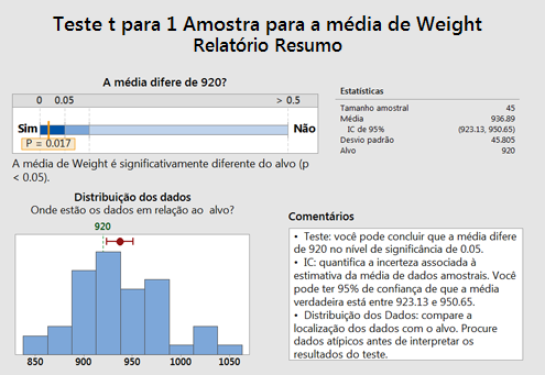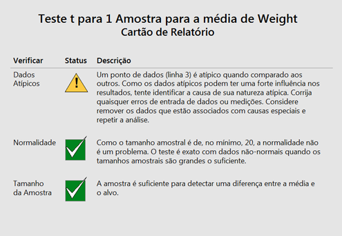 Os Cartões de Relatório verificam sua análise fornecendo verificações de suposições e identificando quaisquer preocupações que você deva conhecer, como pontos de dados atípicos e problemas com a normalidade e o tamanho da amostra.