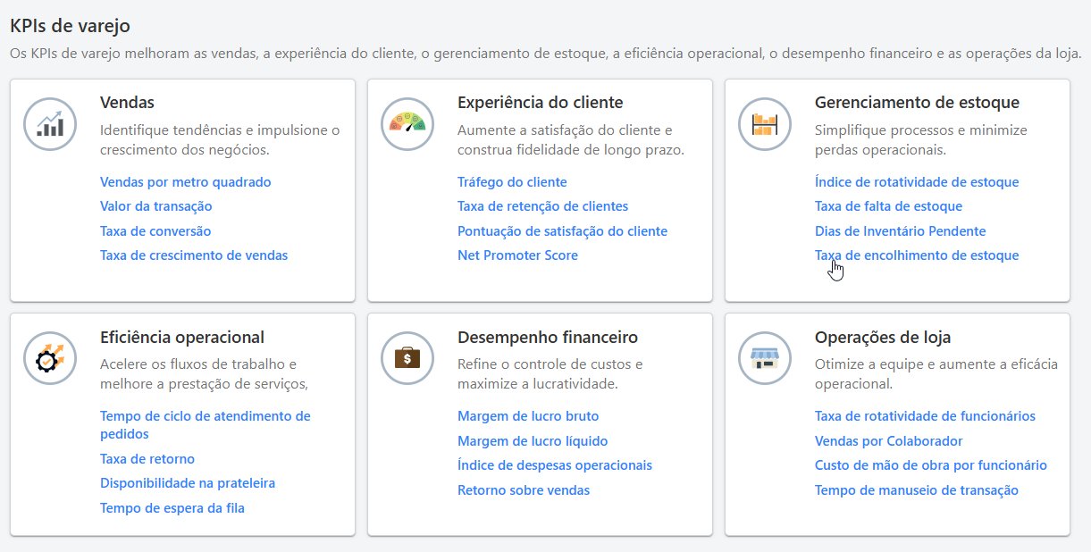 O Módulo de Varejo ajuda os profissionais de varejo a começar rapidamente com a análise de dados para fazer tudo, desde aumentar as vendas até analisar os principais indicadores de desempenho relacionados à experiência do cliente, gerenciamento de estoque, eficiência operacional, desempenho financeiro, operações de loja e vendas.