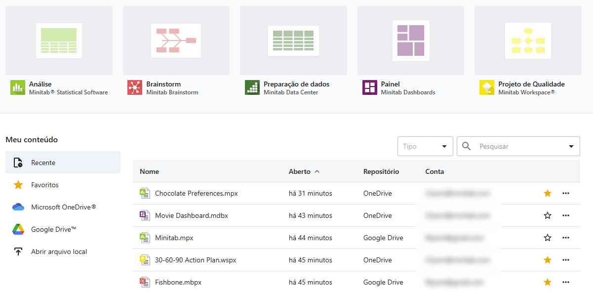 Além do Microsoft OneDrive® e do Google Drive™, os usuários podem navegar até o Microsoft SharePoint® para abrir arquivos na Central de Soluções do Minitab.