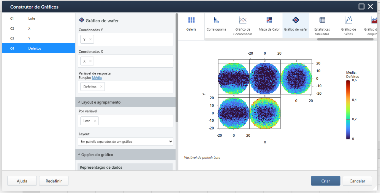 Um gráfico de variabilidade interativo agora está incluído no Construtor de gráficos para visualizar fontes de variação e identificar padrões entre fatores e uma resposta.