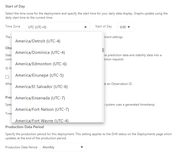 Essa atualização permite que os usuários modifiquem o fuso horário e o início do dia para cada implantação, garantindo que os relatórios de desempenho e replays diários se alinhem com o fuso horário especificado. Além disso, o Model Ops ajustará automaticamente o horário de verão com base no fuso horário selecionado do usuário, fornecendo operações baseadas em tempo perfeitas e precisas.