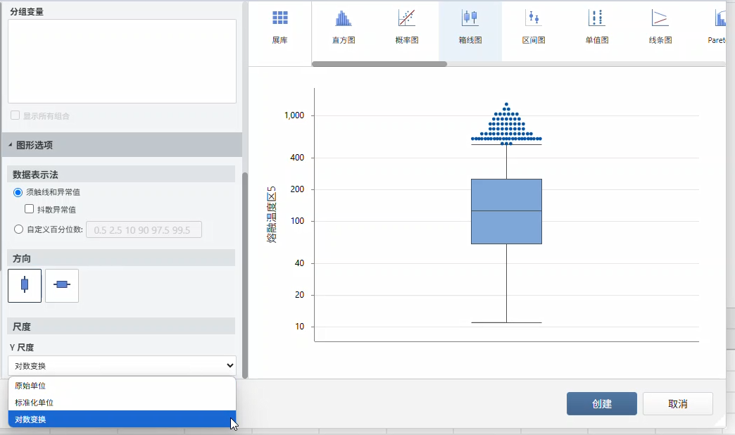 图形生成器现在包括将对数变换应用到箱线图上 Y 尺度的选项。